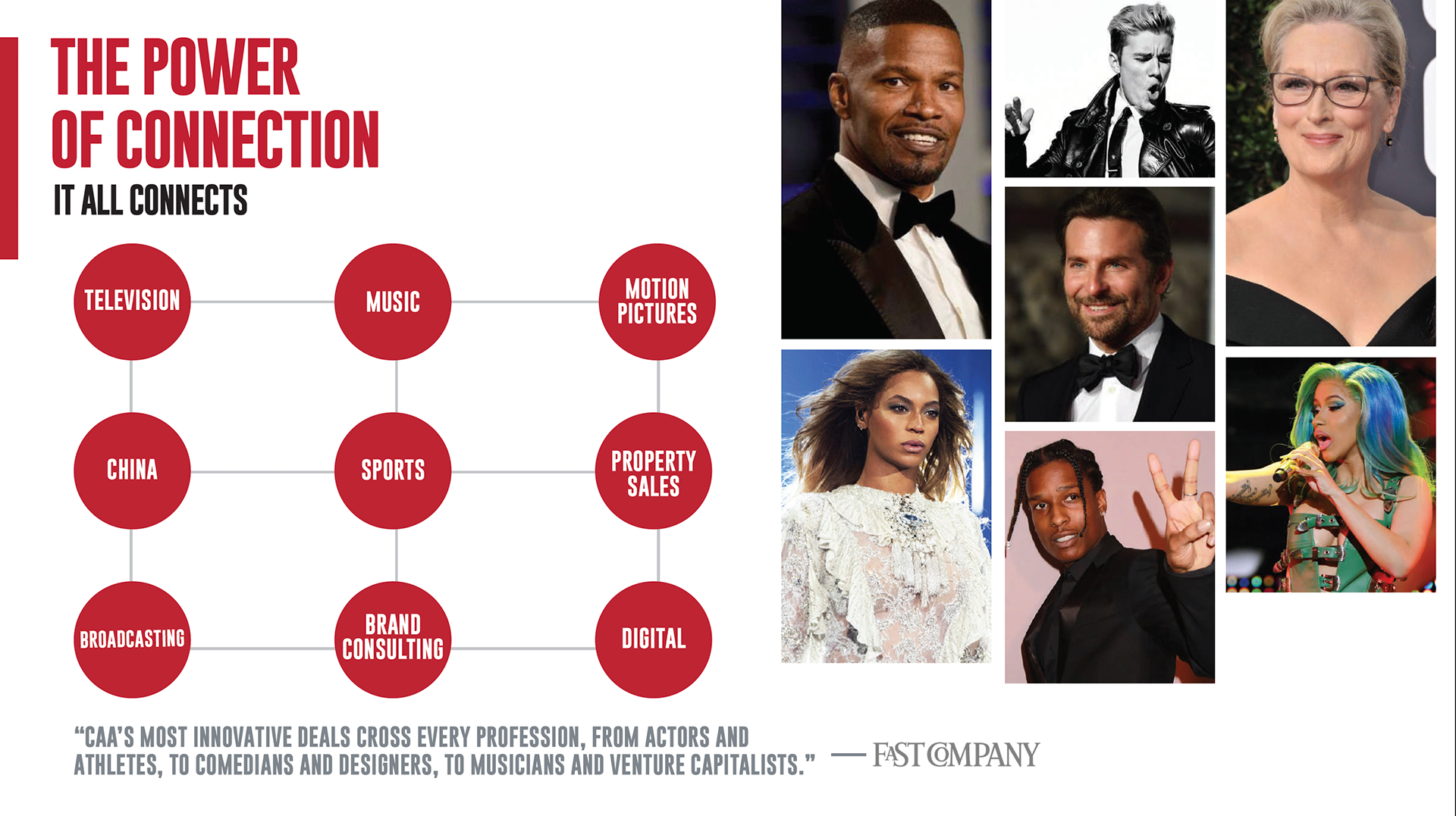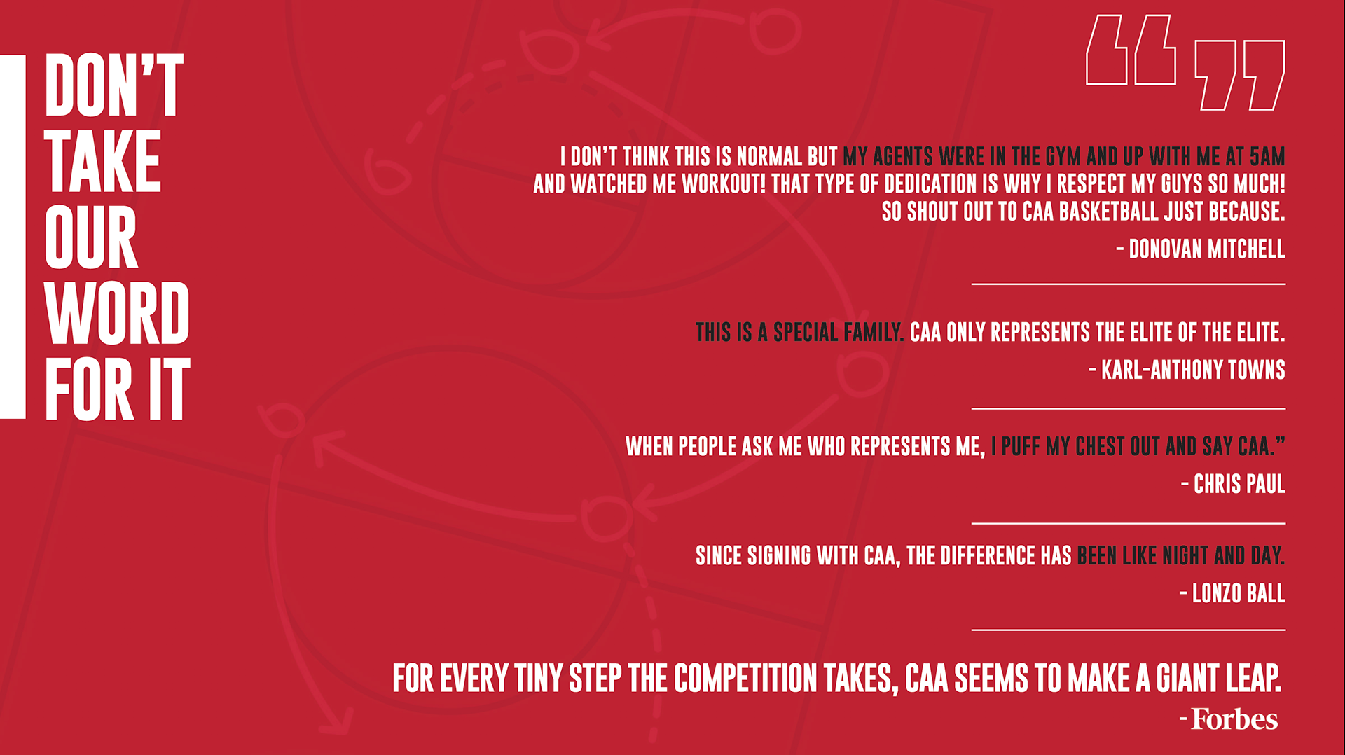 I created a dynamic and cohesive brand system for CAA Sports’ pitch decks, tailored to resonate across all major sports categories. Each deck was designed to be visually striking, easy to navigate, and engaging—helping agents tell clear, compelling stories to clients and partners. The work brought a fresh, energetic tone to CAA’s sports division while making sure each presentation stood out in a competitive space.